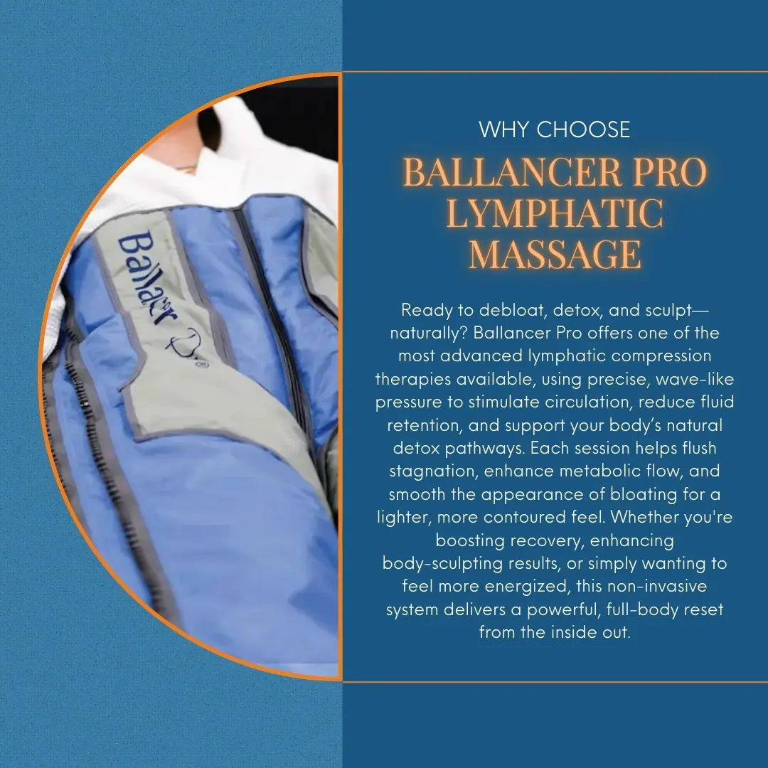 The Ballancer Pro is an FDA‑cleared compression therapy system that uses precision‑sequenced pressure to mimic natural lymphatic flow. This dynamic technology helps stimulate lymph movement more efficiently than manual massage, supporting detoxification, reducing swelling, and enhancing overall physiological wellness.